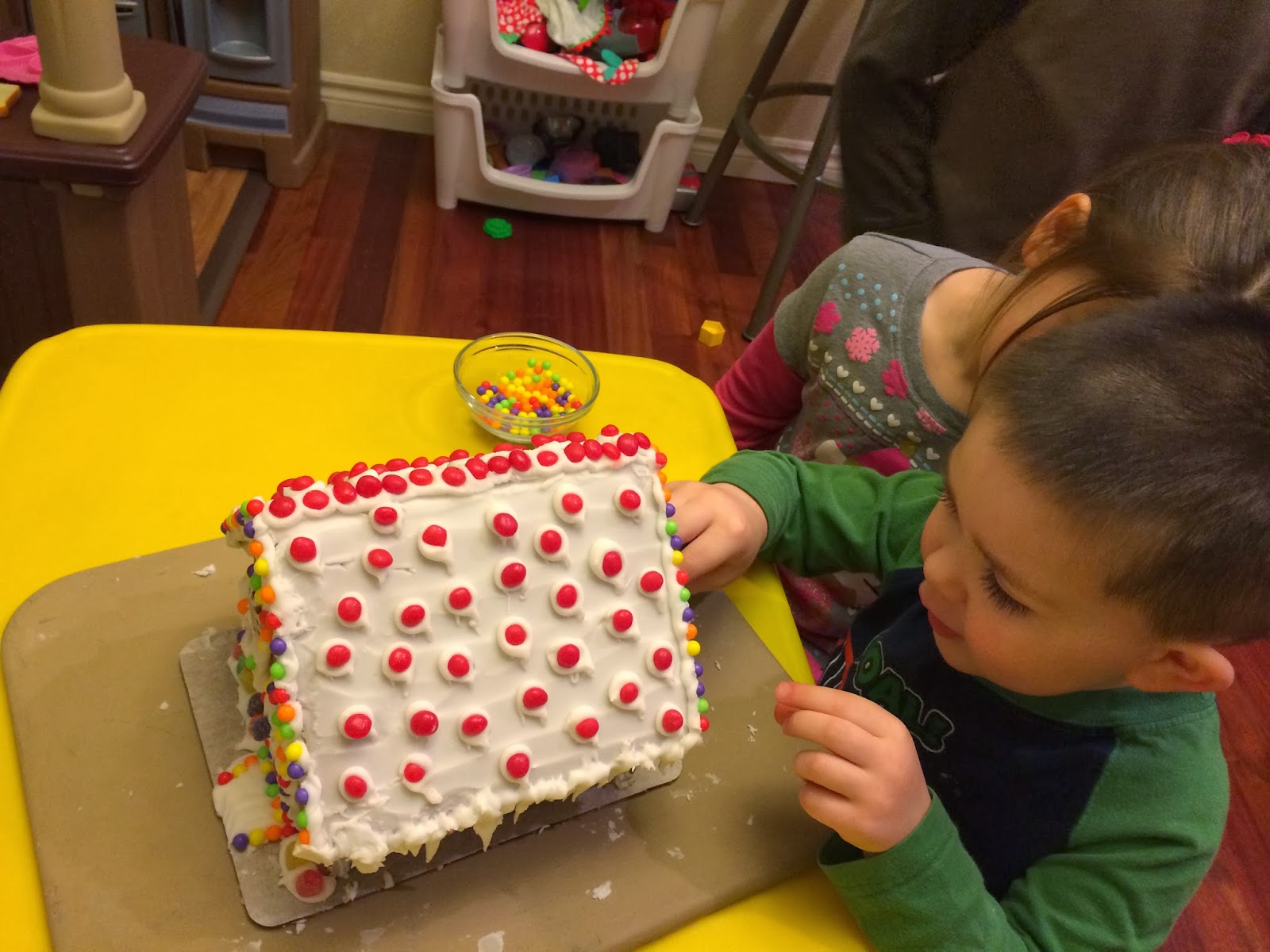 We finally got the gingerbread house decorated.  Of course, a lot of the candy got eaten before it made it onto the house.